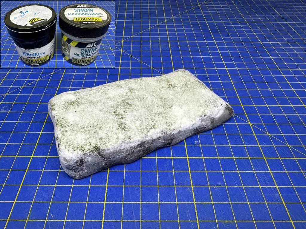 A polystyrene sheet was cut to the shape of the wooden base using a hot wire cutter, and further shaped to a slope once the PVA glue attaching it to the wood had dried. Modelling clay was added to the sides of the polystyrene to create a smooth shape. On the top, small pieces of plaster bands were wetted and placed, to create a harder surface. Once all was dry, AK Interactive “Neutral Texture for Earth” (AK8023) was applied to the top. This was sanded back to a degree when dry and then various brown paints brushed on to create a layer for earth pigments to be applied, using white PVA glue. After this, 1mm static “winter” grass was applied to those parts where glue had been brushed on. Wanting to have a base with the appearance of a light snowfall, I brushed AK Interactive “Snow Sprinkles” (AK8009) on all areas, keeping it quite thin. To this I dropped small amount of AK Interactive “Snow Microballoons” (AK8010), tapped from the end of a dry brush. Not sure if this is the intended use for these products, but it worked to my satisfaction, with some of the grass showing through the layer of snow.