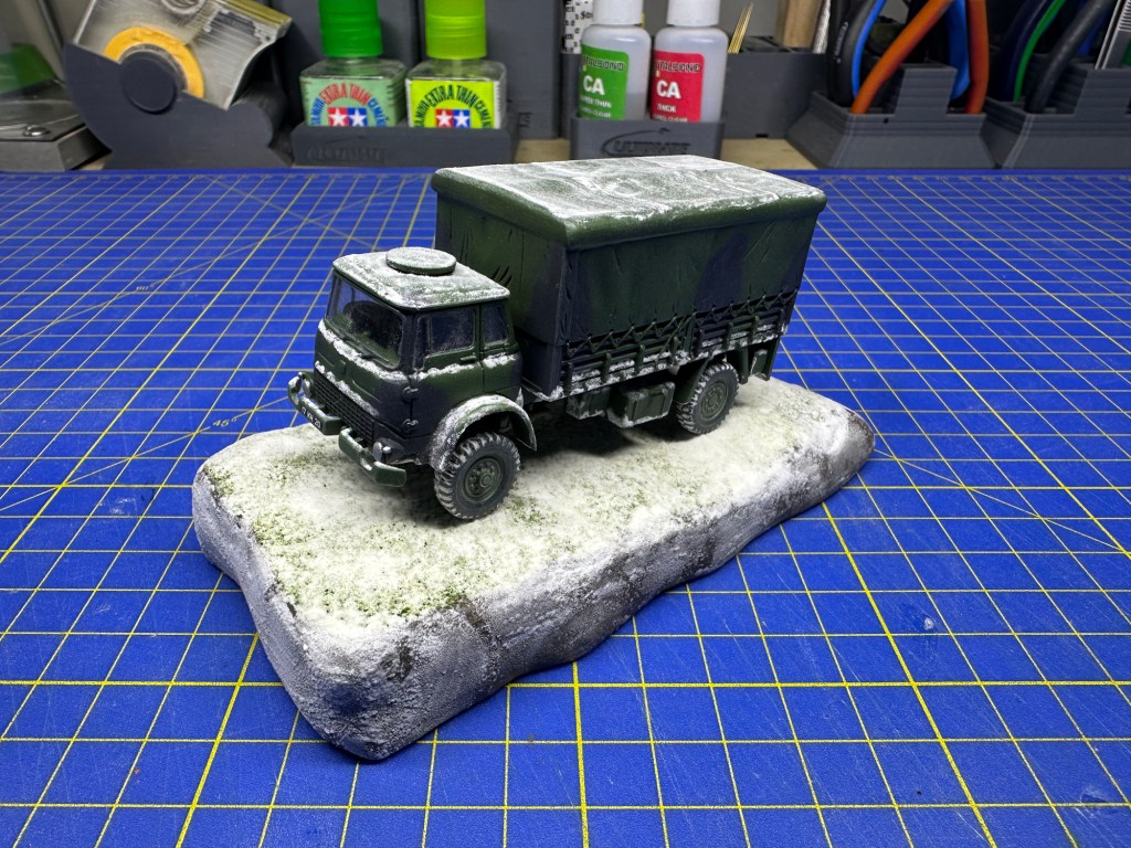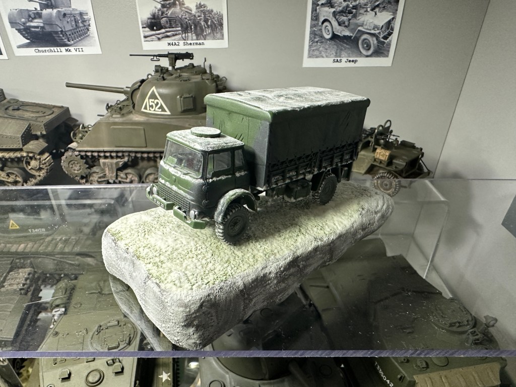 Weathered with a dark wash, the exhaust painted with rust colours and dirt and grime simulated with oil paints, mostly on the lower half. To blend with the base, I used AK Interactive “Snow Sprinkles” (AK8009) – followed by AK Interactive “Snow Microballoons” (AK 8010) bound on top of this – on various exposed parts of the lorry, to simulate a light snowfall.