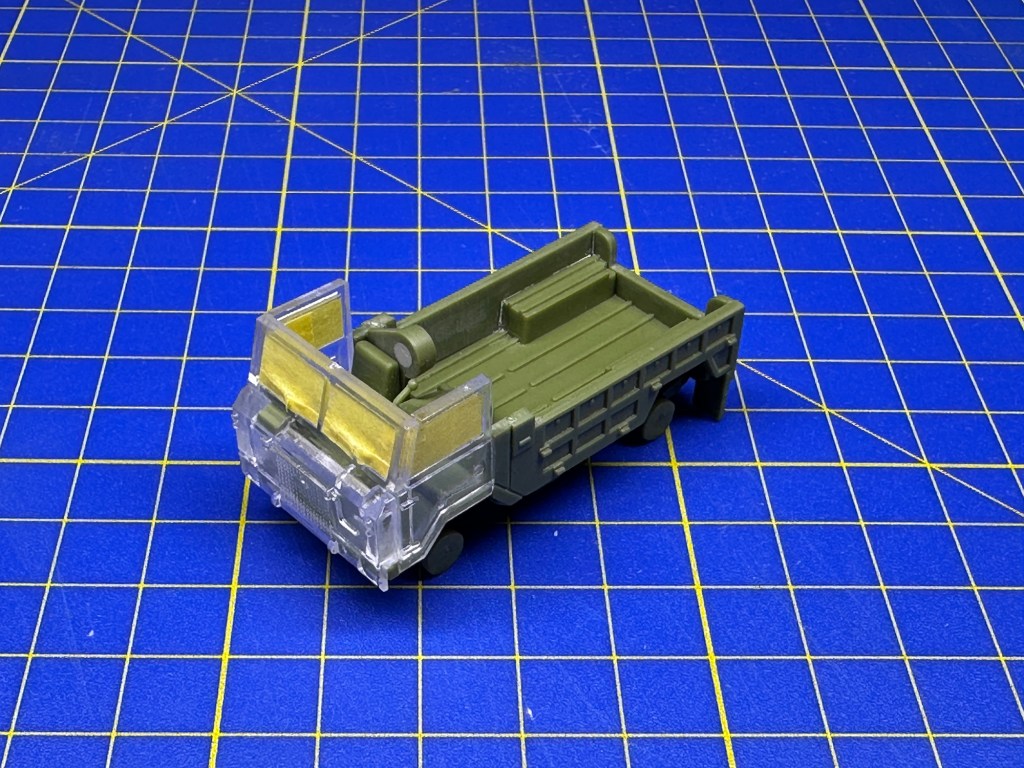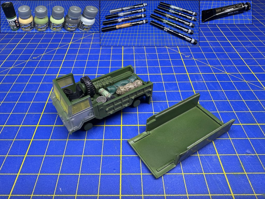 Firstly I painted and weathered the interior – using the paints shown in the images above. I added some 1/72 stowage items to the load area. Then the windows and open back were masked.