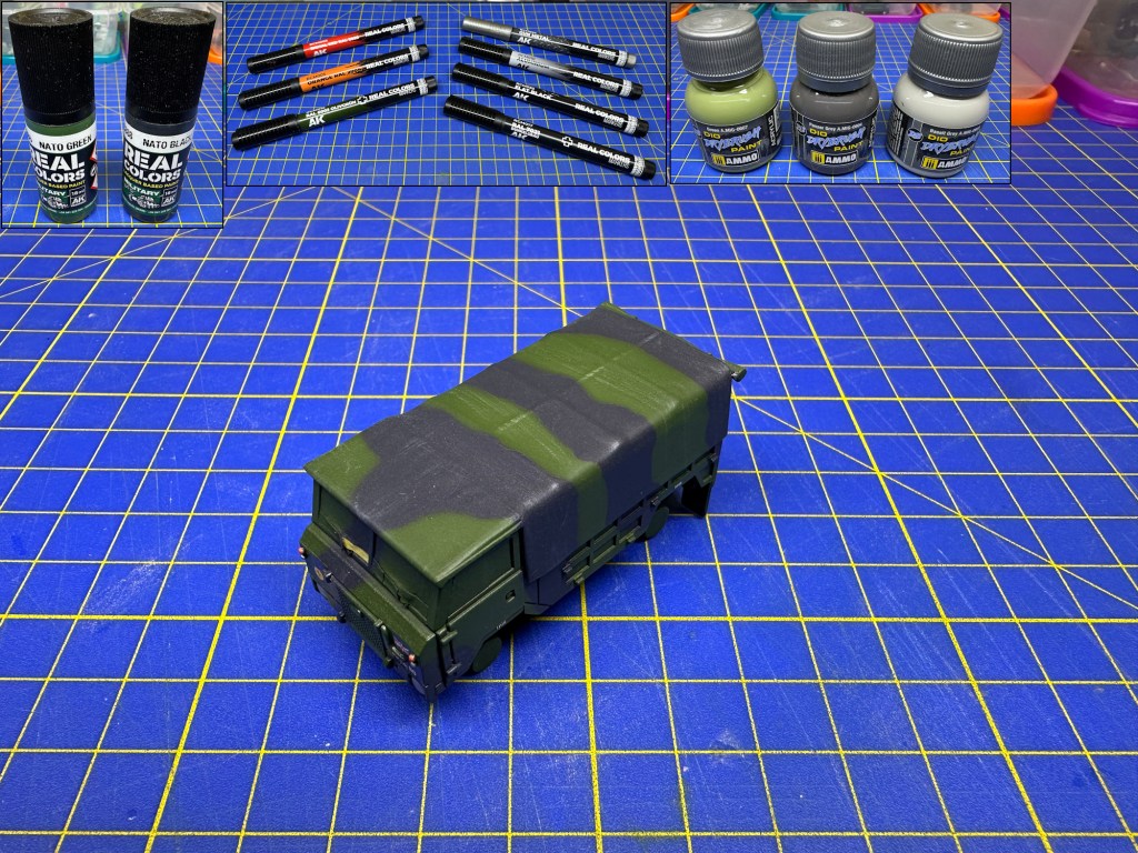 The NATO camouflage scheme was sprayed on and other paints applied, as shown above. The decals were then applied. I will say in passing that – according to the tyre pressure stencils applied above the wheel wells – this vehicle requires the exact same tyre pressures as my car, not too surprising as it is from same stable!
