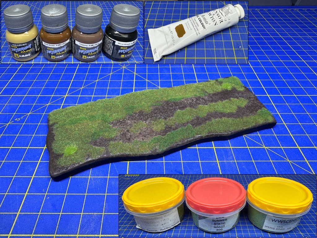 A layer of modelling clay was added to the wooden base. Once dry, AK Interactive “Neutral Texture for Earth” (AK8023) was applied. This was sanded back to a degree when dry and then various brown paints brushed on to create a layer for earth pigments to be glued on, using white PVA glue. I flicked diluted brown oil paint from a brush to create darker patches. After this, 1mm static grass – “spring” and then “summer” – was applied to those parts where glue had been brushed on.
