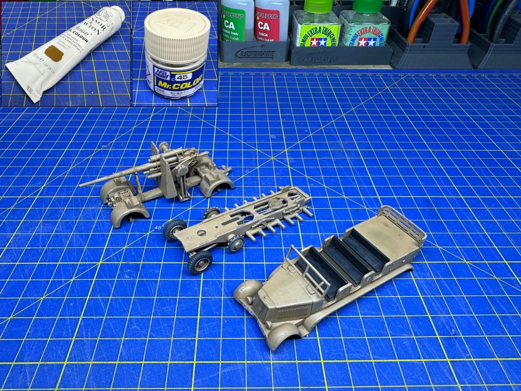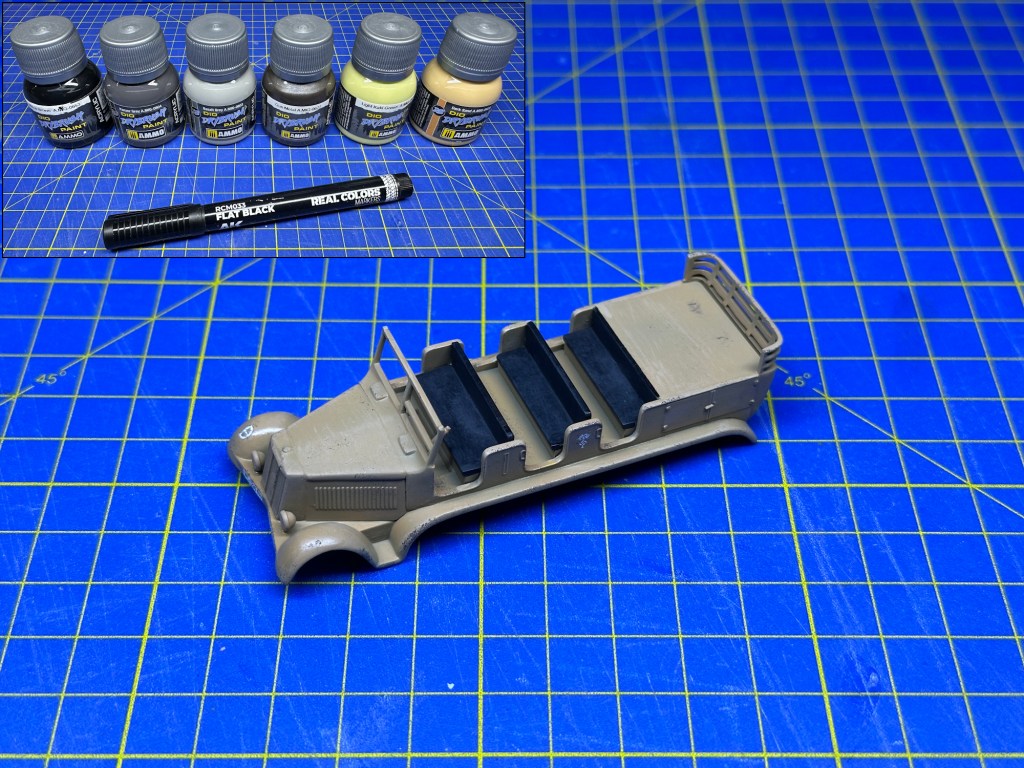 I put some paint chips on the body work using AMMO Drybrush paint “Panzer Grey” (A.MIG-0604), perhaps to show the original paint coming through the desert colour, if indeed that was a thing. After that, I used Winsor & Newton “Raw Umber” oil paint in enamel thinners to give it an overall wash. The entire model was then sprayed with a 10% mix of a beige paint colour in thinners, to give the effect of a dusty look.